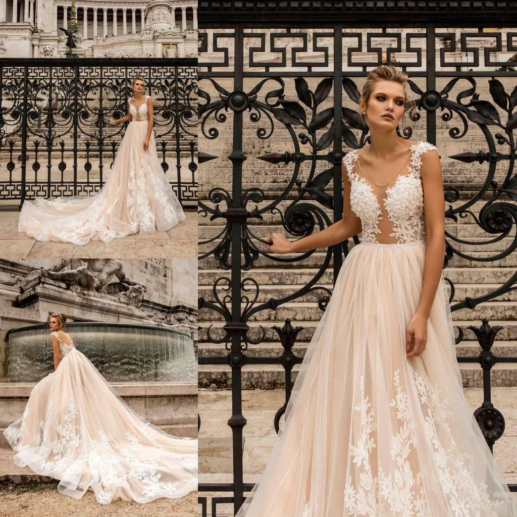Vintage Champagne 2019 Wedding Dresses Jewel Neck Lace Appliqued Sweep Train Beach Sexy Country Style Plus Size Wedding Dress Bridal Gowns - View Full Image