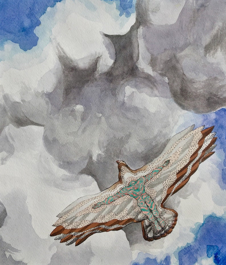 In The Clouds Watercolor Painting Watercolor Prints Hawk Human Figure Flight Clouds Sky Surreal Art Experimental Gift Ideas - View Full Image