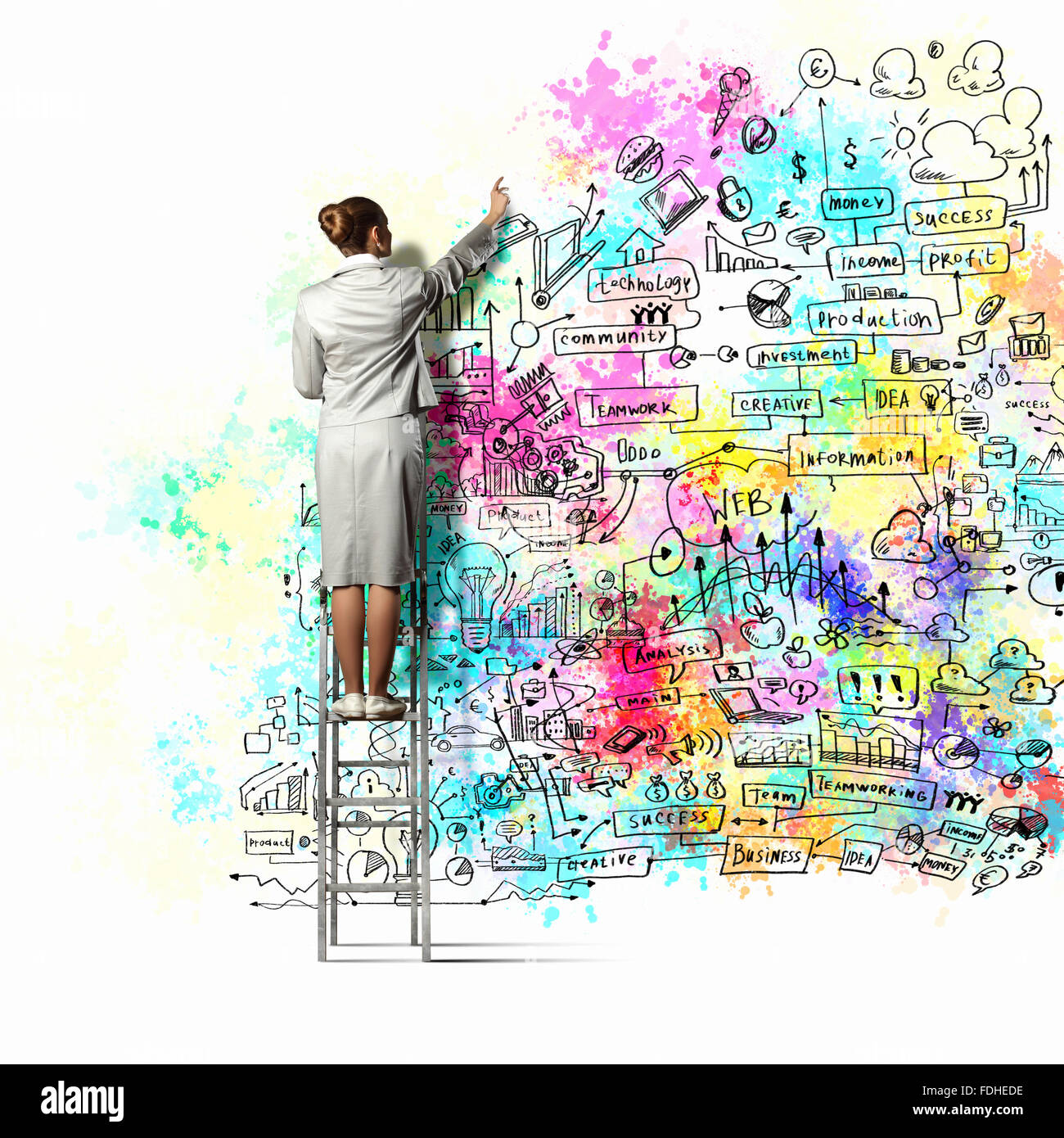 Back View Of Businesswoman Drawing Colorful Business Ideas - View Full Image