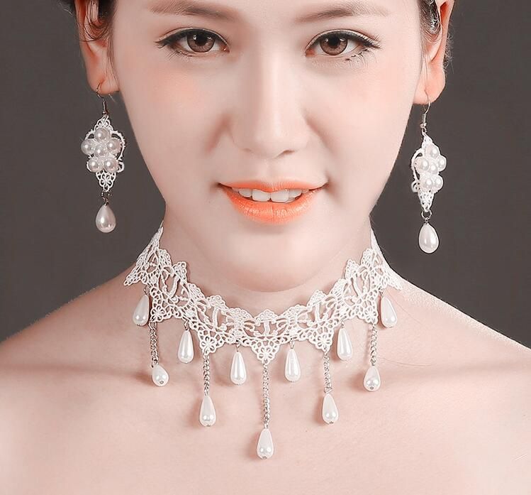 Handmade Lace Choker Necklace Earrings Set Pearl Waterdrop Bride Bridesmaid Jewelry Set For Women Wedding Evening Party Accessories Wedding Jewellery - View Full Image